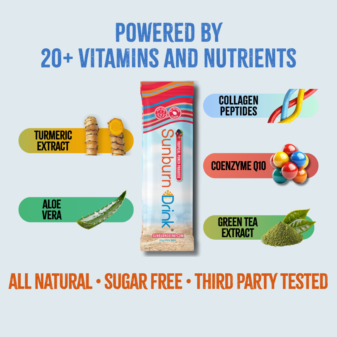 Mix with water for refreshing, sugar free, all natural after sun hydration. Designed for anyone who spends time outdoors. It supports your after sun routine when you are dealing with sun exposure effects like sunburn, sunburn peeling, or peeling after sunburn.